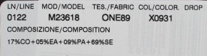Materiale: 17% cotone, 69% seta, 5% elastan, 9% poliammide