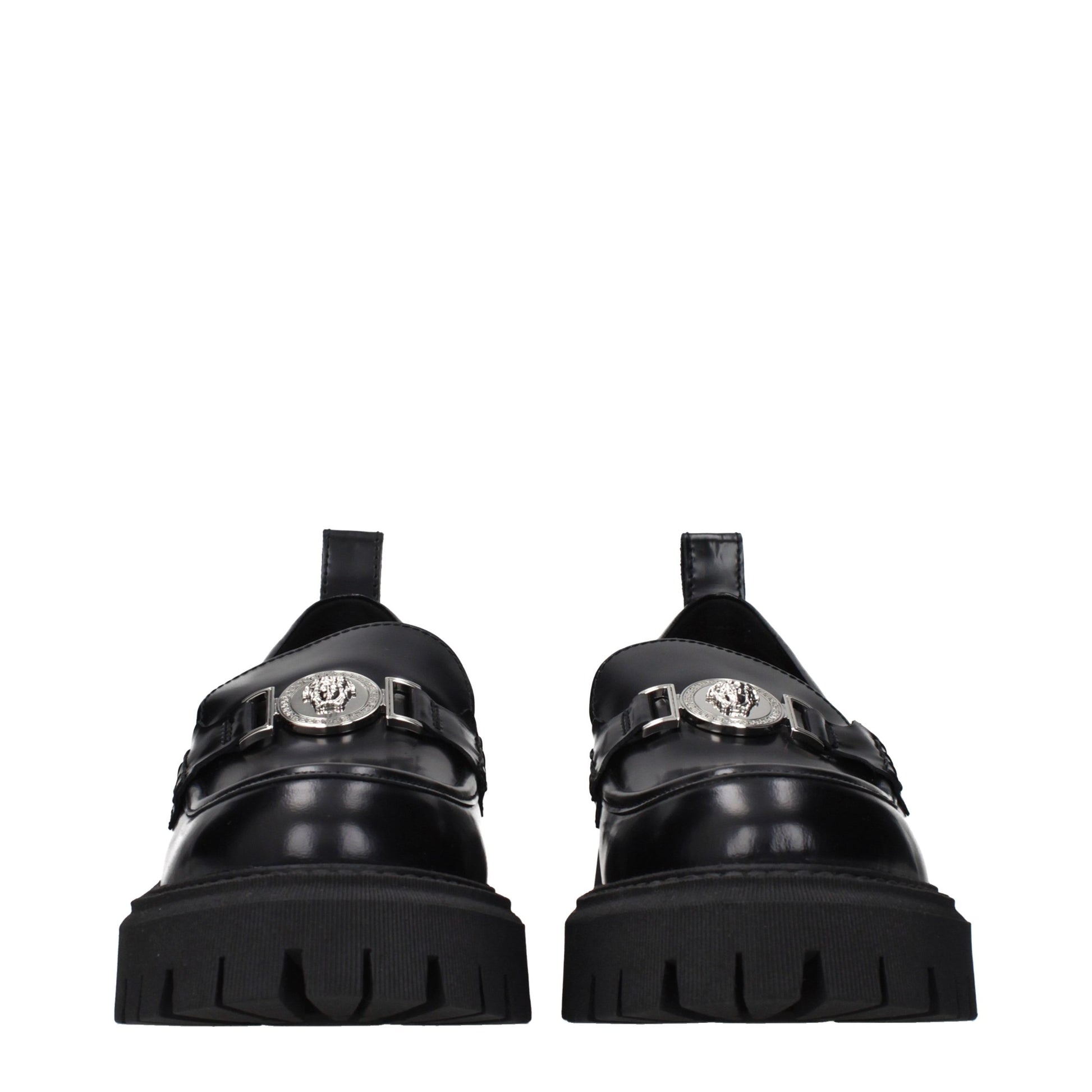 The product with MPN 10147361A086611B00P and code F86271 leather in black is a loafers designed by Versace. It has features like front detail.